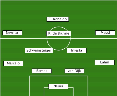 --------------C. Ronaldo--------- --Neymar-------K. de Bruyne---Messi --------Schweinsteiger-Iniesta---- --Marcelo-------------------Lahm-- ----------Ramos-----van Dijk------ ---------------Neuer-------------