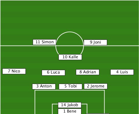 ---------11 Simon---------------- ---------------------9 Joni------ ---------------10 Kalle---------- --7 Nico----6 Luca---8 Adrian-4 Luis ---------3 Anton-5 Tobi-2 Jerome--- ---------------14 Jakob---------- ---------------1 Bene------------
