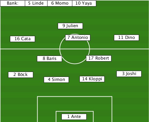 ------5 Linde-------------------- -Bank:-------6 Momo-10 Yaya-------- --------------9 Julien----------- ----16 Cata-----7 Antonio---11 Dino ---------8 Baris-----17 Robert---- ---2 Böck---4 Simon--14 Kloppi-3 Joshi ---------------1 Ante------------