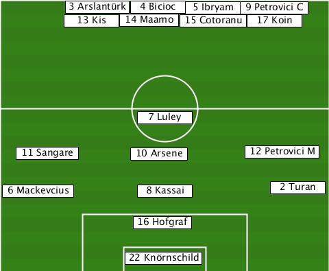 --------------4 Bicioc----------- --------3 Arslantürk-5 Ibryam-9 Petrovici C --------13 Kis-14 Maamo-15 Cotoranu-17 Koin ---------------7 Luley----------- ---11 Sangare--10 Arsene---12 Petrovici M --6 Mackevcius--8 Kassai------2 Turan --------------16 Hofgraf--------- --------------22 Knörnschild-----