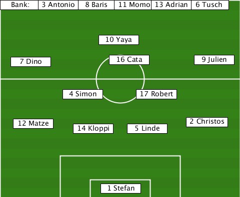 ------------8 Baris-------------- -Bank:--3 Antonio--11 Momo-13 Adrian-6 Tusch ---------------10 Yaya----------- ---7 Dino--------16 Cata-----9 Julien ----------4 Simon----17 Robert---- ---12 Matze-14 Kloppi-5 Linde-2 Christos ---------------1 Stefan----------