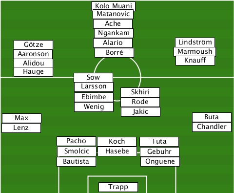 --------------Kolo Muani--------- --------------Matanovic---------- --------------Ache--------------- --------------Ngankam------------ ---Aaronson-Götze-Alidou-Alario-Borré-Marmoush-Lindström-Knauff ---Hauge-----Sow------------------ --Max--------Larsson-Ebimbe-Wenig-Skhiri-Rode-Jakic-Buta --Lenz-----------------------Chandler ---------Pacho--Koch---Tuta-------- ---------Smolcic-Hasebe-Gebuhr----- ---------Bautista-----Onguene----- ---------------Trapp-------------