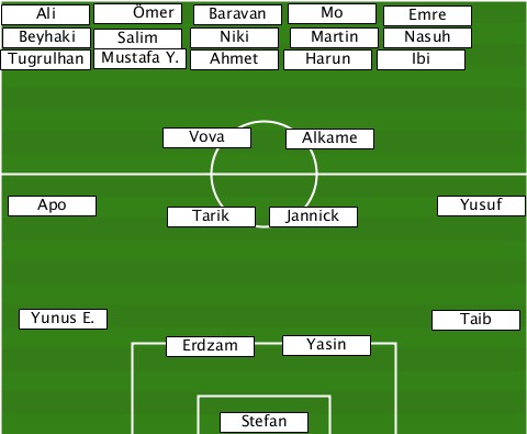 -------Ömer---------------------- --Ali---------Baravan-Mo----Emre---- --Beyhaki-Salim-Niki--Martin-Nasuh--- -Tugrulhan-Mustafa Y.-Ahmet-Harun-Ibi -----------Vova-----Alkame-------- --Apo--------Tarik--Jannick----Yusuf ---Yunus E.------------------Taib- ------------Erdzam--Yasin--------- ---------------Stefan------------