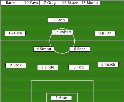 -------10 Yaya------------------- --Bank:------7 Greg-12 Matze-13 Momo --------------11 Dino------------ ---16 Cata------17 Robert---9 Julien ----------4 Simon---8 Baris------- ---2 Böck---5 Linde--3 Tobi---6 Tusch ---------------1 Ante------------