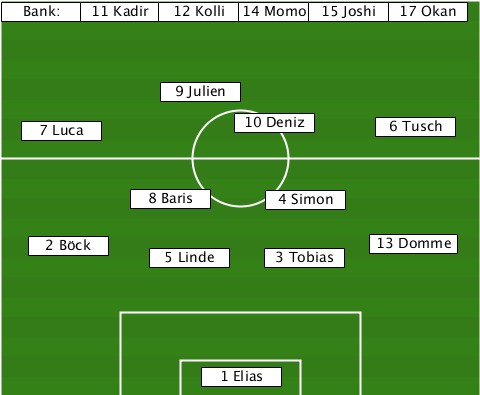 ----------------------15 Joshi--- --Bank:-11 Kadir-12 Kolli-14 Momo-17 Okan ------------9 Julien------------- ---7 Luca---------10 Deniz--6 Tusch ----------8 Baris---4 Simon------- ---2 Böck---5 Linde--3 Tobias-13 Domme ---------------1 Elias-----------