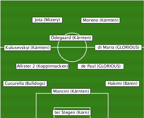 ---------Jota (Mizery)----------- -------------------Moreno (Kärnten) ------------Ödegaard (Kärnten)--- --Kulusevskyi (Kärnten)-di Maria (GLORIOUS) -----Allister 2 (Koppinnacken)-de Paul (GLORIOUS) --Cucurella (Bulldogs)----Hakimi (Bären) -------------Mancini (Kärnten)--- -------------ter Stegen (Korn)---