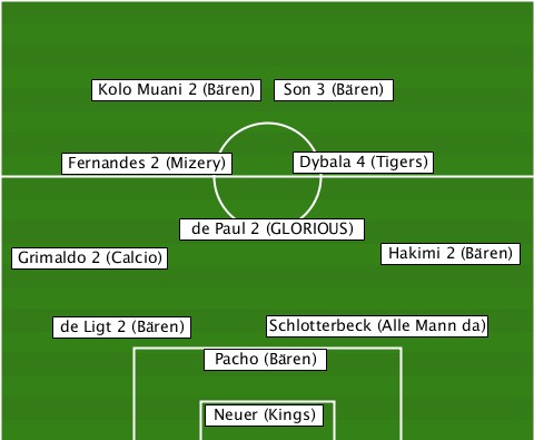 ------------------Son 3 (Bären)-- -------Kolo Muani 2 (Bären)------ -----Fernandes 2 (Mizery)-Dybala 4 (Tigers) ------------de Paul 2 (GLORIOUS)- --Grimaldo 2 (Calcio)----Hakimi 2 (Bären) -----de Ligt 2 (Bären)-Schlotterbeck (Alle Mann da) --------------Pacho (Bären)------ --------------Neuer (Kings)------