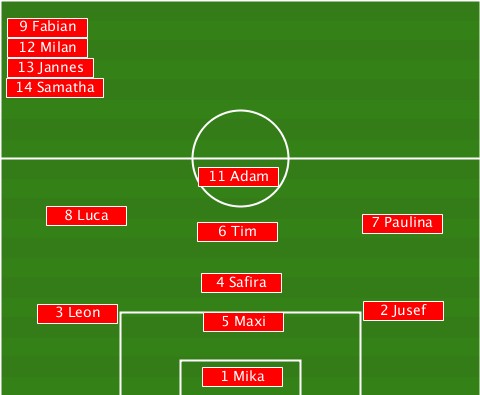 --9 Fabian----------------------- --12 Milan----------------------- --13 Jannes---------------------- --14 Samatha--------------------- ---------------11 Adam----------- -----8 Luca-----6 Tim-------7 Paulina ---------------4 Safira---------- ----3 Leon------5 Maxi------2 Jusef ---------------1 Mika------------