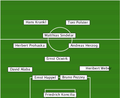 --------Hans Krankl-------------- -------------------Toni Polster-- -------------Matthias Sindelar--- -----Herbert Prohaska-Andreas Herzog -------------Ernst Ocwirk-------- ----David Alaba---------Heribert Weber ----------Ernst Happel-Bruno Pezzey -------------Friedrich Koncilia--