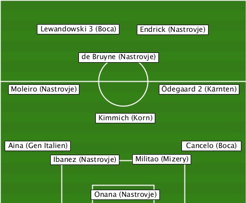 ------Lewandowski 3 (Boca)------- -------------------Endrick (Nastrovje) ------------de Bruyne (Nastrovje) ---Moleiro (Nastrovje)-Ödegaard 2 (Kärnten) --------------Kimmich (Korn)----- --Aina (Gen Italien)------Cancelo (Boca) --------Ibanez (Nastrovje)-Militao (Mizery) -------------Onana (Nastrovje)---