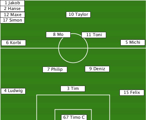 -1 Jakob------------------------- -2 Hanse------------------------- --12 Maxe--------10 Taylor-------- -17 Simon------------------------ ------------8 Mo----11 Toni------- --6 Korbi--------------------5 Michi -----------7 Philip--9 Deniz------ --4 Ludwig------3 Tim---------15 Felix ---------------67 Timo C---------