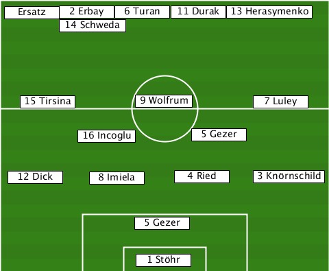-------2 Erbay------------------- --Ersatz------6 Turan-11 Durak-13 Herasymenko -------14 Schweda---------------- ---15 Tirsina---9 Wolfrum---7 Luley ---------16 Incoglu--5 Gezer------ --12 Dick--8 Imiela-4 Ried---3 Knörnschild ---------------5 Gezer----------- ---------------1 Stöhr-----------
