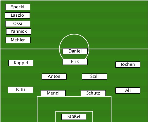 ---Specki------------------------ ---Laszlo------------------------ ---Ossi-------------------------- ---Yannick----------------------- ---Mehler------------------------ ---------------Daniel------------ ---Kappel-------Erik--------Jochen- ----------Anton-----Szili--------- ---Patti---Mendi-----Schütz--Ali---- ---------------Stößel------------