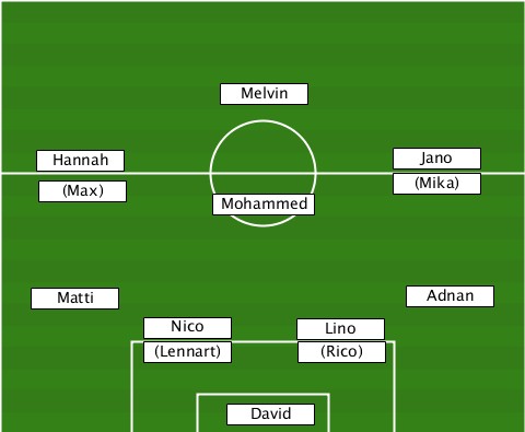 ---------------Melvin------------ ----Hannah----------------Jano---- ----(Max)------Mohammed----(Mika)-- ---Matti-------------------Adnan-- ----------Nico-------Lino--------- ----------(Lennart)--(Rico)------- ---------------David-------------