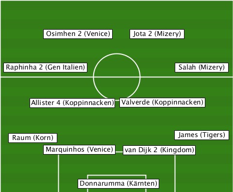 -------------------Jota 2 (Mizery) -------Osimhen 2 (Venice)-------- --Raphinha 2 (Gen Italien)-Salah (Mizery) ------Allister 4 (Koppinnacken)-Valverde (Koppinnacken) ---Raum (Korn)------------James (Tigers) -------Marquinhos (Venice)-van Dijk 2 (Kingdom) ------------Donnarumma (Kärnten)-