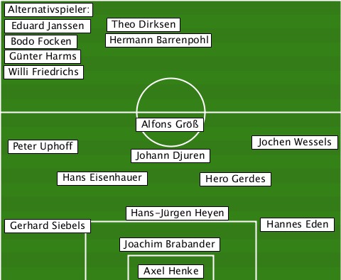 --Alternativspieler:------------- --Eduard Janssen-Theo Dirksen----- --Bodo Focken-Hermann Barrenpohl-- --Günter Harms------------------- --Willi Friedrichs--------------- --------------Alfons Größ-------- --Peter Uphoff-Johann Djuren-Jochen Wessels -------Hans Eisenhauer-Hero Gerdes -------------Hans-Jürgen Heyen--- --Gerhard Siebels----------Hannes Eden -------------Joachim Brabander--- --------------Axel Henke---------