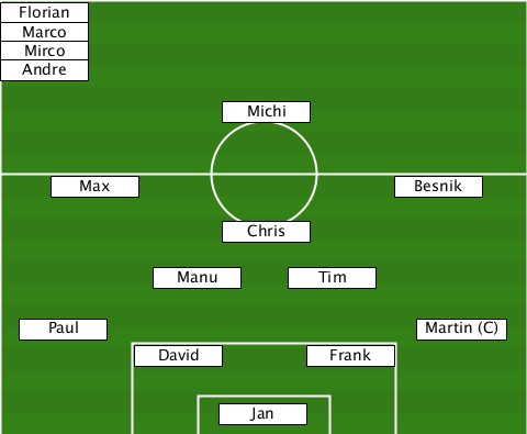 -Florian------------------------- -Marco--------------------------- -Mirco--------------------------- -Andre--------------------------- ---------------Michi------------- -----Max------------------Besnik-- ---------------Chris------------- -----------Manu-----Tim----------- ---Paul---------------------Martin (C) ----------David------Frank-------- ---------------Jan---------------