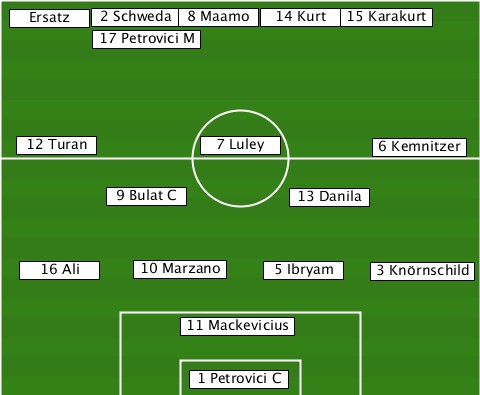 ------------------------15 Karakurt --Ersatz-2 Schweda-8 Maamo-14 Kurt-- --------17 Petrovici M----------- ---12 Turan-----7 Luley-----6 Kemnitzer ---------9 Bulat C----13 Danila--- ---16 Ali--10 Marzano-5 Ibryam-3 Knörnschild -------------11 Mackevicius------ --------------1 Petrovici C------