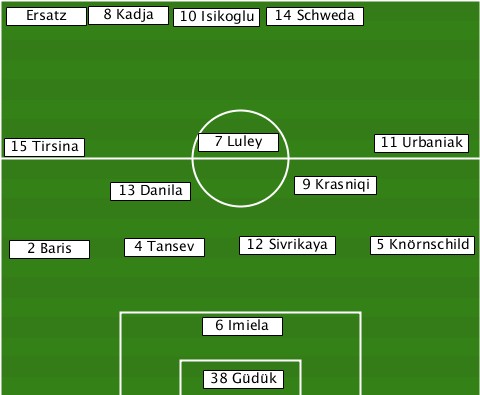 -------8 Kadja------------------- --Ersatz------10 Isikoglu-14 Schweda --15 Tirsina----7 Luley-----11 Urbaniak ---------13 Danila----9 Krasniqi-- --2 Baris--4 Tansev-12 Sivrikaya-5 Knörnschild ---------------6 Imiela---------- ---------------38 Güdük----------