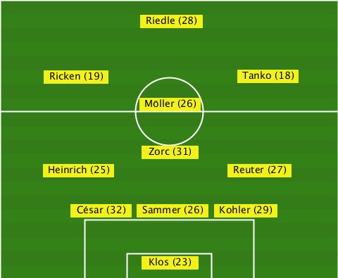 ---------------Riedle (28)------- ------Ricken (19)--------Tanko (18) ---------------Möller (26)------- ---------------Zorc (31)--------- ------Heinrich (25)-----Reuter (27) --------César (32)-Sammer (26)-Kohler (29) ---------------Klos (23)---------