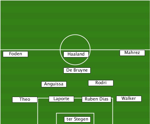 ---------------------------Mahrez --Foden---------Haaland----------- ---------------De Bruyne--------- ----------Anguissa---Rodri-------- ----Theo-----Laporte-Ruben Dias-Walker ---------------ter Stegen--------