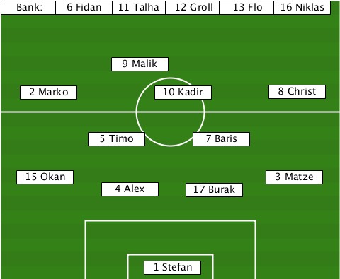 ---------------------------16 Niklas --Bank:-6 Fidan-11 Talha-12 Groll-13 Flo ------------9 Malik-------------- ---2 Marko-------10 Kadir----8 Christ ----------5 Timo-----7 Baris------ ---15 Okan-----------------3 Matze -----------4 Alex---17 Burak------ ---------------1 Stefan----------