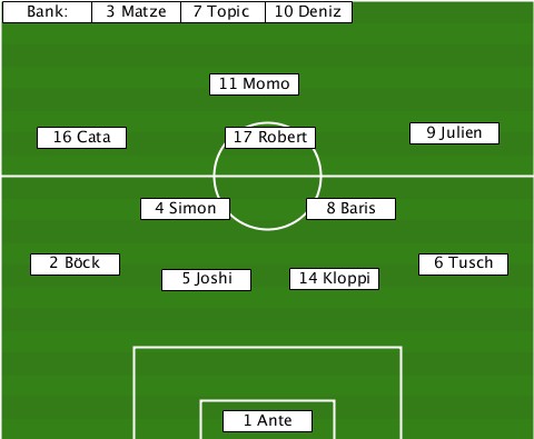 -----------------10 Deniz-------- --Bank:-3 Matze-7 Topic------------ --------------11 Momo------------ ----16 Cata-----17 Robert---9 Julien ----------4 Simon----8 Baris------ ---2 Böck---5 Joshi--14 Kloppi-6 Tusch ---------------1 Ante------------