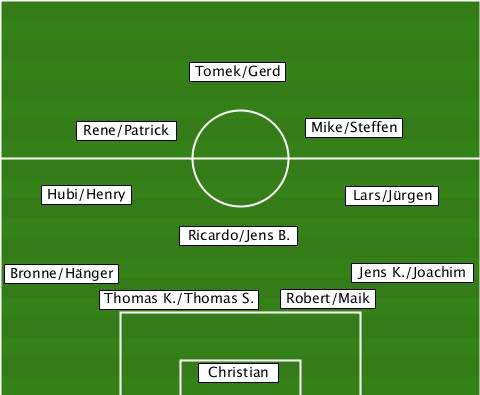 --------------Tomek/Gerd--------- -------Rene/Patrick----Mike/Steffen ----Hubi/Henry-----------Lars/Jürgen -------------Ricardo/Jens B.----- --Bronne/Hänger-----------Jens K./Joachim --------Thomas K./Thomas S.-Robert/Maik ---------------Christian---------