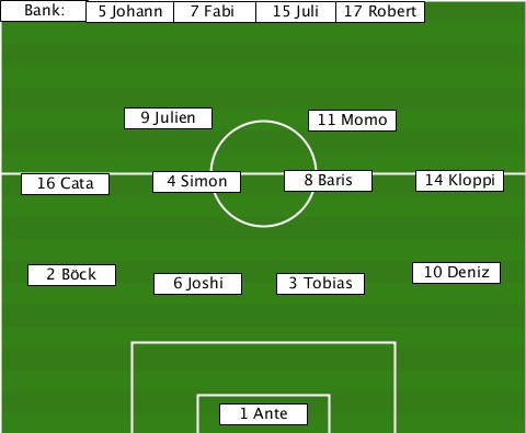 -Bank:--------------------------- -------5 Johann-7 Fabi-15 Juli-17 Robert ---------9 Julien----11 Momo------ ---16 Cata--4 Simon--8 Baris--14 Kloppi ---2 Böck---6 Joshi-3 Tobias--10 Deniz ---------------1 Ante------------