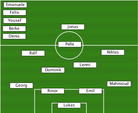 --Emanuele----------------------- --Felix-------------------------- --Yousef------------------------- --Berke----------Jonas------------ --Denis-------------------------- ---------------Pelle------------- ------Ralf----------------Niklas-- ------------------Lenni---------- -----------Dominik--------------- ----Georg------------------Mahmoud -----------Rinor-----Emil--------- ---------------Lukas-------------