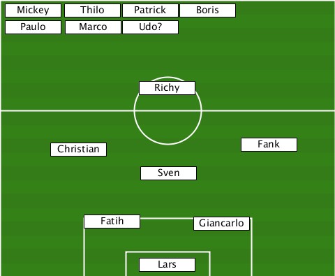 --------Thilo-------------------- --Mickey------Patrick-Boris-------- --Paulo--Marco-Udo?---------------- ---------------Richy------------- ------Christian----------Fank----- ---------------Sven-------------- ---------Fatih-------Giancarlo---- ---------------Lars--------------