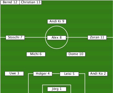 -------Christian 13-------------- --Bernd 12----------------------- ---------------Andi Ki 9--------- ---Stoschi 7----Alex 8------Zoran 11 ---------Michi 6-----Dome 10------ ---Uwe 3----Holger 4-Leisi 5-Andi Ko 2 ---------------Jörg 1------------