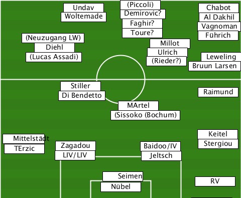 -----------------(Piccoli)------- ----(Neuzugang LW)-(Lucas Assadi)-Diehl-Woltemade-Undav-Demirovic?-Faghir?-Toure?-(Rieder?)-Ulrich-Millot-Bruun Larsen-Vagnoman-Führich-Chabot-Al Dakhil-Leweling ---------Di Bendetto-Stiller--Raimund -----------------MArtel---------- ----------------(Sissoko (Bochum) --Mittelstädt-TErzic-LIV/LIV-Zagadou-Baidoo/IV-Jeltsch-Keitel-Stergiou ---------------Nübel-Seimen--RV----