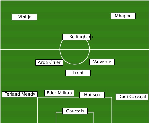 -------------------------Mbappe-- ----Vini jr---------------------- ---------------Bellingham-------- ---------Arda Güler---Valverde---- ----------------Trent------------ --Ferland Mendy-Eder Militao-Huijsen-Dani Carvajal ---------------Courtois----------