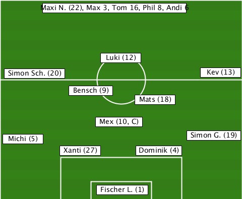 -------Maxi N. (22), Max 3, Tom 16, Phil 8, Andi 6 ---------------Luki (12)--------- --Simon Sch. (20)------------Kev (13) -----------Bensch (9)------------ -------------------Mats (18)----- --------------Mex (10, C)-------- --Michi (5)----------------Simon G. (19) ---------Xanti (27)-Dominik (4)--- --------------Fischer L. (1)-----