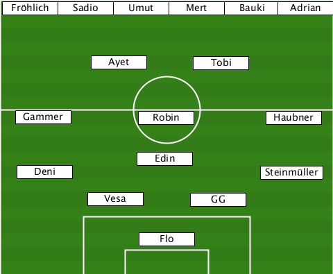------------------Mert----------- --Fröhlich-Sadio-Umut-----Bauki-Adrian ----------Ayet-------Tobi--------- ---Gammer-------Robin--------Haubner ---------------Edin-------------- ---Deni--------------------Steinmüller ----------Vesa-------GG----------- ---------------Flo---------------