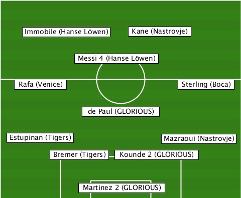 ------------------Kane (Nastrovje) ----Immobile (Hanse Löwen)------- -----------Messi 4 (Hanse Löwen)- ---Rafa (Venice)----------Sterling (Boca) ------------de Paul (GLORIOUS)--- --Estupinan (Tigers)----Mazraoui (Nastrovje) --------Bremer (Tigers)-Kounde 2 (GLORIOUS) ------------Martinez 2 (GLORIOUS)