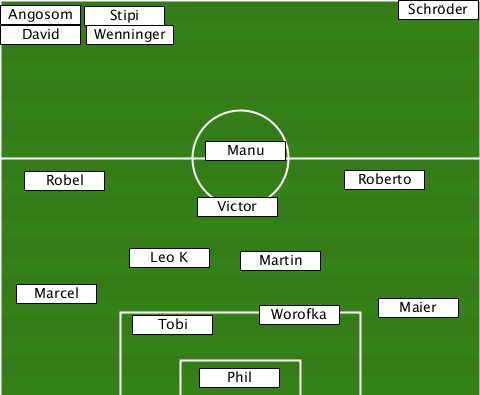 ----------------------------Schröder -Angosom-Stipi-------------------- -David--Wenninger----------------- ---------------Manu-------------- ---Robel-----------------Roberto-- ---------------Victor------------ ----------Leo K---Martin---------- ---Marcel--Tobi------Worofka--Maier- ---------------Phil--------------