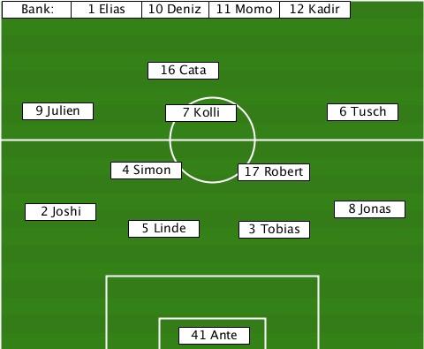 --Bank:-------------------------- -------1 Elias-10 Deniz-11 Momo-12 Kadir -------------16 Cata------------- ---9 Julien----7 Kolli------6 Tusch ----------4 Simon---17 Robert----- ---2 Joshi------------------8 Jonas -----------5 Linde--3 Tobias------ ---------------41 Ante-----------