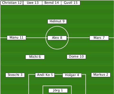 --------Uwe 13------------------- --Christian 12-Bernd 14-Gustl 15--- ---------------Helmut 9---------- ---Manu 11------Alex 8-------Marc 7 ---------Michi 6-----Dome 10------ ---Stoschi 3-Andi Ko 5-Holger 4-Markus 2 ---------------Jörg 1------------