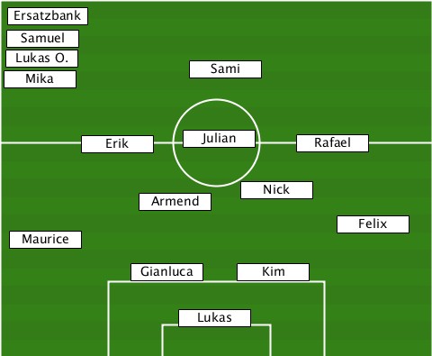 --Ersatzbank--------------------- --Samuel------------------------- --Mika-Lukas O.--Sami-------------- -------Erik-----Julian---Rafael---- ------------Armend--Nick---------- --------------------------Felix-- --Maurice------------------------ -----------Gianluca-Kim----------- ---------------Lukas-------------