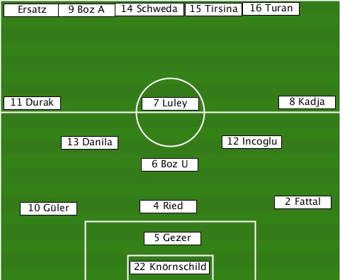 ------------------------16 Turan- --Ersatz-9 Boz A-14 Schweda-15 Tirsina --11 Durak------7 Luley-------8 Kadja -------13 Danila-------12 Incoglu- ---------------6 Boz U----------- ---10 Güler-----4 Ried-------2 Fattal ---------------5 Gezer----------- --------------22 Knörnschild-----