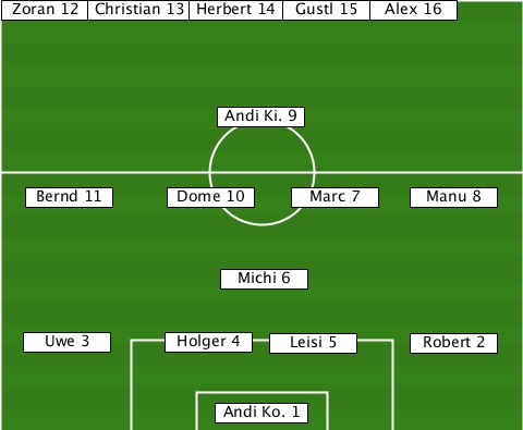------------------------Alex 16-- --Zoran 12-Christian 13-Herbert 14-Gustl 15 ---------------Andi Ki. 9-------- ---Bernd 11--Dome 10-Marc 7---Manu 8 ---------------Michi 6----------- ---Uwe 3-----Holger 4-Leisi 5-Robert 2 ---------------Andi Ko. 1--------