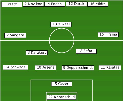 -------------------12 Durak------ --Ersatz-2 Novikov-4 Enden-16 Yildiz ---------------13 Yüksel--------- ---7 Sangare----------------15 Tirsina --------3 Karakurt----8 Safta----- --14 Schweda-10 Arsene-9 Depperschmidt-11 Karatas ---------------5 Gezer----------- --------------22 Knörnschild-----