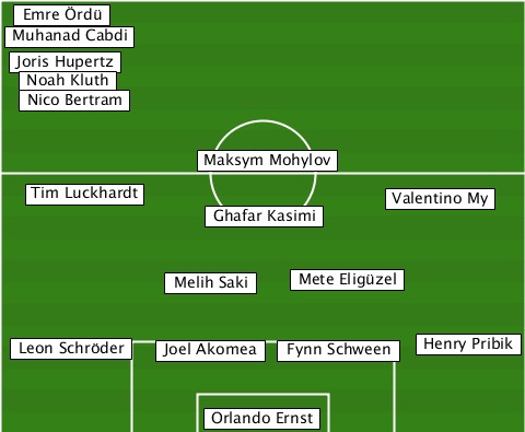 --Emre Ördü---------------------- --Muhanad Cabdi------------------ --Joris Hupertz------------------ ---Noah Kluth-------------------- ---Nico Bertram------------------ -------------Maksym Mohylov------ ---Tim Luckhardt----------Valentino My --------------Ghafar Kasimi------ -----------Melih Saki-Mete Eligüzel --Leon Schröder-Joel Akomea-Fynn Schween-Henry Pribik --------------Orlando Ernst------