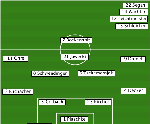 ----------------------------22 Segan ---------------------------14 Wachter -------------------------17 Teichtmeister --------------------------13 Schleicher --------------7 Böckenholt------- --11 Öhre------21 Jawecki----9 Drexel --------8 Schwendinger-6 Tschemernjak --3 Buchacher---------------4 Decker ----------5 Gorbach--23 Kircher--- --------------1 Plaschke---------