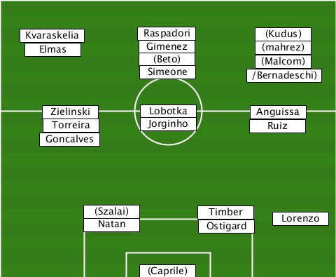 ---------------Raspadori--------- ---kvaraskelia-------------(Kudus) ----Elmas-------Gimenez-(Beto)-(mahrez)-(Malcom) ---------------Simeone----/Bernadeschi) -----Zielinski--Lobotka----Anguissa ------Torreira--Jorginho---Ruiz---- -----Goncalves------------------- ---------(Szalai)-Natan-Timber-Ostigard-Lorenzo ---------------(Caprile)---------