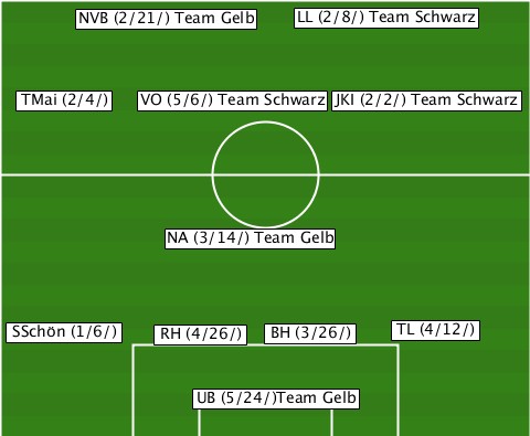 -------------------LL (2/8/) Team Schwarz ------NVB (2/21/) Team Gelb------ --TMai (2/4/)-VO (5/6/) Team Schwarz-JKI (2/2/) Team Schwarz -----------NA (3/14/) Team Gelb-- --SSchön (1/6/)-RH (4/26/)-BH (3/26/)-TL (4/12/) -------------UB (5/24/)Team Gelb-