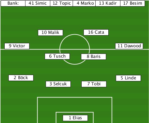 ----------------------13 Kadir--- --Bank:-41 Simic-12 Topic-4 Marko-17 Besim ----------10 Malik--16 Cata------- --9 Victor-----------------11 Dawood -----------6 Tusch--8 Baris------- ---2 Böck------------------5 Linde -----------3 Selcuk-7 Tobi-------- ---------------1 Elias-----------