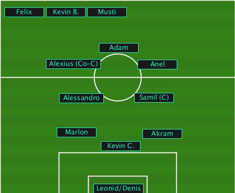 --Felix-------------------------- --------Kevin B.-Musti------------ ---------------Adam-------------- --------Alexius (Co-C)-Anel------- ----------Alessandro-Samil (C)---- ---------Marlon-------Akram------- ---------------Kevin C.---------- --------------Leonid/Denis-------